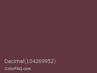 Decimal 104269952 Color is a dark red color and the nearest color is Wine Dregs #673147. Hex code #613640 and RGB value is rgb(97,54,64). In RGB color space, this color is composed of 38% red, 21% green, 25% blue, In CMYK color space, this color is composed of 0% cyan, 44% magenta, 34% yellow , 62% black , In HSL color space, this color has a hue angle of 346° , 28% saturation and 30% lightness.
