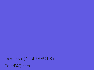 Decimal 104333913 Color is a light indigo color and the nearest color is Majorelle Blue #6050dc. Hex code #615ae3 and RGB value is rgb(97,90,227). In RGB color space, this color is composed of 38% red, 35% green, 89% blue, In CMYK color space, this color is composed of 57% cyan, 60% magenta, 0% yellow , 11% black , In HSL color space, this color has a hue angle of 243° , 71% saturation and 62% lightness.