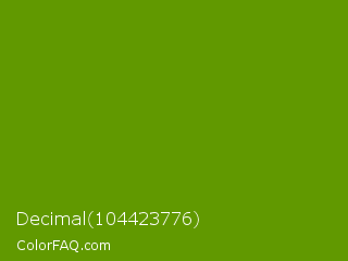 Decimal 104423776 Color is a dark green color and the nearest color is Limeade #6f9d02. Hex code #619900 and RGB value is rgb(97,153,0). In RGB color space, this color is composed of 38% red, 60% green, 0% blue, In CMYK color space, this color is composed of 37% cyan, 0% magenta, 100% yellow , 40% black , In HSL color space, this color has a hue angle of 82° , 100% saturation and 30% lightness.