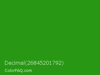 Decimal 26845201792 Color is a normal green color and the nearest color is Slimy Green #299617. Hex code #289814 and RGB value is rgb(40,152,20). In RGB color space, this color is composed of 16% red, 60% green, 8% blue, In CMYK color space, this color is composed of 74% cyan, 0% magenta, 87% yellow , 40% black , In HSL color space, this color has a hue angle of 111° , 77% saturation and 34% lightness.