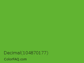 Decimal 104870177 Color is a normal green color and the nearest color is Green RYB #66b032. Hex code #61b431 and RGB value is rgb(97,180,49). In RGB color space, this color is composed of 38% red, 71% green, 19% blue, In CMYK color space, this color is composed of 46% cyan, 0% magenta, 73% yellow , 29% black , In HSL color space, this color has a hue angle of 98° , 57% saturation and 45% lightness.