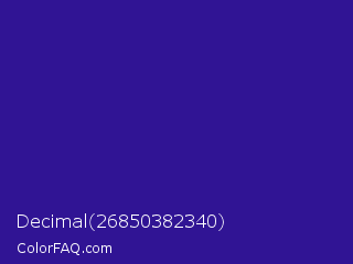 Decimal 26850382340 Color is a normal indigo color and the nearest color is Blue Gem #2c0e8c. Hex code #301494 and RGB value is rgb(48,20,148). In RGB color space, this color is composed of 19% red, 8% green, 58% blue, In CMYK color space, this color is composed of 68% cyan, 86% magenta, 0% yellow , 42% black , In HSL color space, this color has a hue angle of 253° , 76% saturation and 33% lightness.