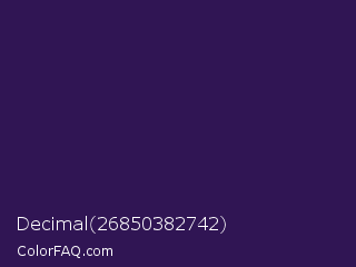 Decimal 26850382742 Color is a very dark violet color and the nearest color is Russian Violet #32174d. Hex code #301554 and RGB value is rgb(48,21,84). In RGB color space, this color is composed of 19% red, 8% green, 33% blue, In CMYK color space, this color is composed of 43% cyan, 75% magenta, 0% yellow , 67% black , In HSL color space, this color has a hue angle of 266° , 60% saturation and 21% lightness.
