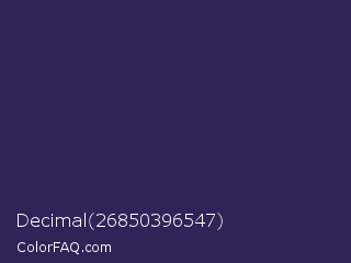 Decimal 26850396547 Color is a dark indigo color and the nearest color is Deep Grape #381a51. Hex code #302357 and RGB value is rgb(48,35,87). In RGB color space, this color is composed of 19% red, 14% green, 34% blue, In CMYK color space, this color is composed of 45% cyan, 60% magenta, 0% yellow , 66% black , In HSL color space, this color has a hue angle of 255° , 43% saturation and 24% lightness.