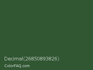Decimal 26850893826 Color is a dark green color and the nearest color is Mughal Green #306030. Hex code #305632 and RGB value is rgb(48,86,50). In RGB color space, this color is composed of 19% red, 34% green, 20% blue, In CMYK color space, this color is composed of 44% cyan, 0% magenta, 42% yellow , 66% black , In HSL color space, this color has a hue angle of 123° , 28% saturation and 26% lightness.