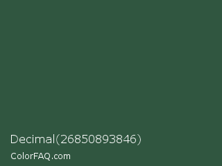 Decimal 26850893846 Color is a dark green color and the nearest color is Hunter Green #355e3b. Hex code #305640 and RGB value is rgb(48,86,64). In RGB color space, this color is composed of 19% red, 34% green, 25% blue, In CMYK color space, this color is composed of 44% cyan, 0% magenta, 26% yellow , 66% black , In HSL color space, this color has a hue angle of 145° , 28% saturation and 26% lightness.