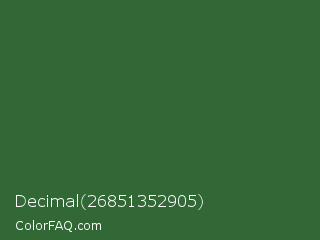 Decimal 26851352905 Color is a dark green color and the nearest color is Mughal Green #306030. Hex code #316835 and RGB value is rgb(49,104,53). In RGB color space, this color is composed of 19% red, 41% green, 21% blue, In CMYK color space, this color is composed of 53% cyan, 0% magenta, 49% yellow , 59% black , In HSL color space, this color has a hue angle of 124° , 36% saturation and 30% lightness.