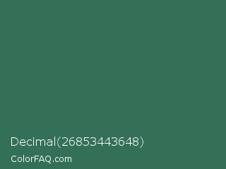 Decimal 26853443648 Color is a normal green color and the nearest color is Amazon #3b7a57. Hex code #347058 and RGB value is rgb(52,112,88). In RGB color space, this color is composed of 20% red, 44% green, 35% blue, In CMYK color space, this color is composed of 54% cyan, 0% magenta, 21% yellow , 56% black , In HSL color space, this color has a hue angle of 156° , 37% saturation and 32% lightness.
