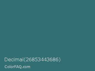 Decimal 26853443686 Color is a normal cyan color and the nearest color is Oracle #377475. Hex code #347072 and RGB value is rgb(52,112,114). In RGB color space, this color is composed of 20% red, 44% green, 45% blue, In CMYK color space, this color is composed of 54% cyan, 2% magenta, 0% yellow , 55% black , In HSL color space, this color has a hue angle of 182° , 37% saturation and 33% lightness.