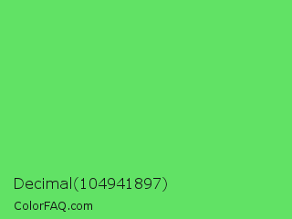 Decimal 104941897 Color is a light green color and the nearest color is Pastel Green #77dd77. Hex code #61e265 and RGB value is rgb(97,226,101). In RGB color space, this color is composed of 38% red, 89% green, 40% blue, In CMYK color space, this color is composed of 57% cyan, 0% magenta, 55% yellow , 11% black , In HSL color space, this color has a hue angle of 122° , 69% saturation and 63% lightness.