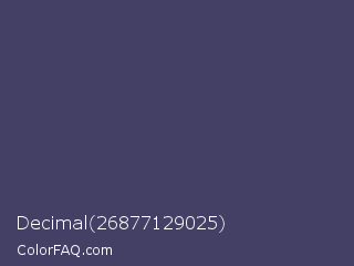 Decimal 26877129025 Color is a normal indigo color and the nearest color is Mulled Wine #4e4562. Hex code #444065 and RGB value is rgb(68,64,101). In RGB color space, this color is composed of 27% red, 25% green, 40% blue, In CMYK color space, this color is composed of 33% cyan, 37% magenta, 0% yellow , 60% black , In HSL color space, this color has a hue angle of 246° , 22% saturation and 32% lightness.