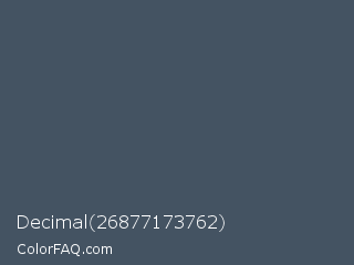 Decimal 26877173762 Color is a normal blue color and the nearest color is Fiord #405169. Hex code #445362 and RGB value is rgb(68,83,98). In RGB color space, this color is composed of 27% red, 33% green, 38% blue, In CMYK color space, this color is composed of 31% cyan, 15% magenta, 0% yellow , 62% black , In HSL color space, this color has a hue angle of 210° , 18% saturation and 33% lightness.