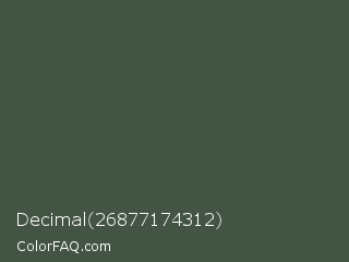 Decimal 26877174312 Color is a dark green color and the nearest color is Gray Asparagus #465945. Hex code #445444 and RGB value is rgb(68,84,68). In RGB color space, this color is composed of 27% red, 33% green, 27% blue, In CMYK color space, this color is composed of 19% cyan, 0% magenta, 19% yellow , 67% black , In HSL color space, this color has a hue angle of 120° , 11% saturation and 30% lightness.