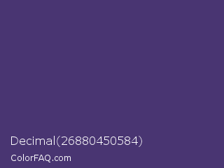 Decimal 26880450584 Color is a normal indigo color and the nearest color is Minsk #3f307f. Hex code #493572 and RGB value is rgb(73,53,114). In RGB color space, this color is composed of 29% red, 21% green, 45% blue, In CMYK color space, this color is composed of 36% cyan, 54% magenta, 0% yellow , 55% black , In HSL color space, this color has a hue angle of 260° , 37% saturation and 33% lightness.