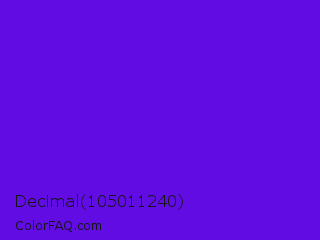 Decimal 105011240 Color is a normal violet color and the nearest color is Han Purple #5218fa. Hex code #620ce4 and RGB value is rgb(98,12,228). In RGB color space, this color is composed of 38% red, 5% green, 89% blue, In CMYK color space, this color is composed of 57% cyan, 95% magenta, 0% yellow , 11% black , In HSL color space, this color has a hue angle of 264° , 90% saturation and 47% lightness.