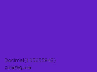 Decimal 105055843 Color is a normal violet color and the nearest color is Purple Heart Crayola #652dc1. Hex code #621fc7 and RGB value is rgb(98,31,199). In RGB color space, this color is composed of 38% red, 12% green, 78% blue, In CMYK color space, this color is composed of 51% cyan, 84% magenta, 0% yellow , 22% black , In HSL color space, this color has a hue angle of 264° , 73% saturation and 45% lightness.