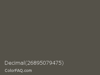 Decimal 26895079475 Color is a normal orange color and the nearest color is Fuscous Gray #54534d. Hex code #555249 and RGB value is rgb(85,82,73). In RGB color space, this color is composed of 33% red, 32% green, 29% blue, In CMYK color space, this color is composed of 0% cyan, 4% magenta, 14% yellow , 67% black , In HSL color space, this color has a hue angle of 45° , 8% saturation and 31% lightness.