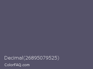 Decimal 26895079525 Color is a normal indigo color and the nearest color is Scarpa Flow #585562. Hex code #555269 and RGB value is rgb(85,82,105). In RGB color space, this color is composed of 33% red, 32% green, 41% blue, In CMYK color space, this color is composed of 19% cyan, 22% magenta, 0% yellow , 59% black , In HSL color space, this color has a hue angle of 248° , 12% saturation and 37% lightness.
