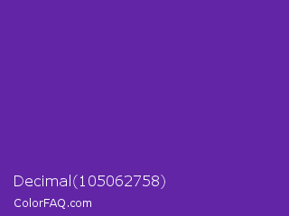 Decimal 105062758 Color is a normal violet color and the nearest color is Grape #6f2da8. Hex code #6225a6 and RGB value is rgb(98,37,166). In RGB color space, this color is composed of 38% red, 15% green, 65% blue, In CMYK color space, this color is composed of 41% cyan, 78% magenta, 0% yellow , 35% black , In HSL color space, this color has a hue angle of 268° , 64% saturation and 40% lightness.