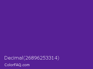 Decimal 26896253314 Color is a normal violet color and the nearest color is Daisy Bush #4f2398. Hex code #572096 and RGB value is rgb(87,32,150). In RGB color space, this color is composed of 34% red, 13% green, 59% blue, In CMYK color space, this color is composed of 42% cyan, 79% magenta, 0% yellow , 41% black , In HSL color space, this color has a hue angle of 268° , 65% saturation and 36% lightness.