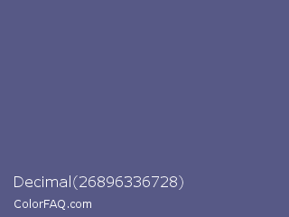 Decimal 26896336728 Color is a normal blue color and the nearest color is Purple Navy #4e5180. Hex code #575986 and RGB value is rgb(87,89,134). In RGB color space, this color is composed of 34% red, 35% green, 53% blue, In CMYK color space, this color is composed of 35% cyan, 34% magenta, 0% yellow , 47% black , In HSL color space, this color has a hue angle of 237° , 21% saturation and 43% lightness.