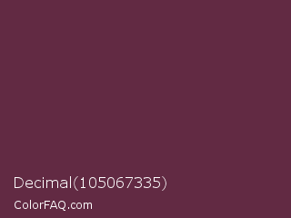 Decimal 105067335 Color is a dark rose color and the nearest color is Tawny Port #692545. Hex code #622a43 and RGB value is rgb(98,42,67). In RGB color space, this color is composed of 38% red, 16% green, 26% blue, In CMYK color space, this color is composed of 0% cyan, 57% magenta, 32% yellow , 62% black , In HSL color space, this color has a hue angle of 333° , 40% saturation and 27% lightness.