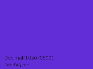 Decimal 105070599 Color is a normal indigo color and the nearest color is Purple Heart Crayola #652dc1. Hex code #622cd7 and RGB value is rgb(98,44,215). In RGB color space, this color is composed of 38% red, 17% green, 84% blue, In CMYK color space, this color is composed of 54% cyan, 80% magenta, 0% yellow , 16% black , In HSL color space, this color has a hue angle of 259° , 68% saturation and 51% lightness.