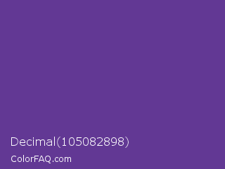 Decimal 105082898 Color is a normal violet color and the nearest color is Rebecca Purple #663399. Hex code #623894 and RGB value is rgb(98,56,148). In RGB color space, this color is composed of 38% red, 22% green, 58% blue, In CMYK color space, this color is composed of 34% cyan, 62% magenta, 0% yellow , 42% black , In HSL color space, this color has a hue angle of 267° , 45% saturation and 40% lightness.