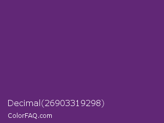 Decimal 26903319298 Color is a normal purple color and the nearest color is Imperial #602f6b. Hex code #612776 and RGB value is rgb(97,39,118). In RGB color space, this color is composed of 38% red, 15% green, 46% blue, In CMYK color space, this color is composed of 18% cyan, 67% magenta, 0% yellow , 54% black , In HSL color space, this color has a hue angle of 284° , 50% saturation and 31% lightness.