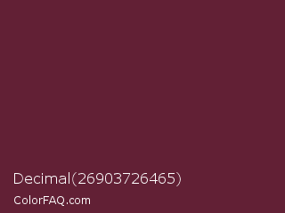 Decimal 26903726465 Color is a dark rose color and the nearest color is Wine Berry #591d35. Hex code #622035 and RGB value is rgb(98,32,53). In RGB color space, this color is composed of 38% red, 13% green, 21% blue, In CMYK color space, this color is composed of 0% cyan, 67% magenta, 46% yellow , 62% black , In HSL color space, this color has a hue angle of 341° , 51% saturation and 25% lightness.