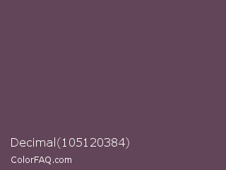 Decimal 105120384 Color is a normal magenta color and the nearest color is Eggplant #614051. Hex code #624558 and RGB value is rgb(98,69,88). In RGB color space, this color is composed of 38% red, 27% green, 35% blue, In CMYK color space, this color is composed of 0% cyan, 30% magenta, 10% yellow , 62% black , In HSL color space, this color has a hue angle of 321° , 17% saturation and 33% lightness.
