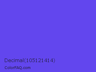 Decimal 105121414 Color is a normal indigo color and the nearest color is Majorelle Blue #6050dc. Hex code #6246ee and RGB value is rgb(98,70,238). In RGB color space, this color is composed of 38% red, 27% green, 93% blue, In CMYK color space, this color is composed of 59% cyan, 71% magenta, 0% yellow , 7% black , In HSL color space, this color has a hue angle of 250° , 83% saturation and 60% lightness.