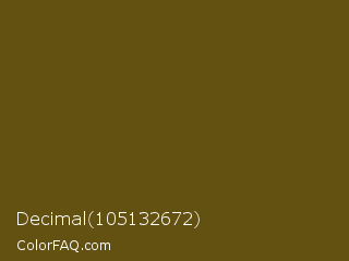 Decimal 105132672 Color is a very dark yellow color and the nearest color is Horses Neck #604913. Hex code #625110 and RGB value is rgb(98,81,16). In RGB color space, this color is composed of 38% red, 32% green, 6% blue, In CMYK color space, this color is composed of 0% cyan, 17% magenta, 84% yellow , 62% black , In HSL color space, this color has a hue angle of 48° , 72% saturation and 22% lightness.
