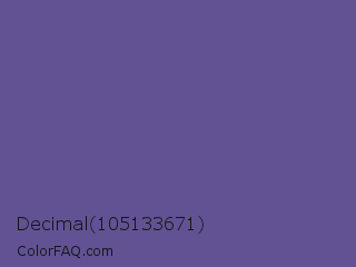 Decimal 105133671 Color is a normal indigo color and the nearest color is Butterfly Bush #624e9a. Hex code #625293 and RGB value is rgb(98,82,147). In RGB color space, this color is composed of 38% red, 32% green, 58% blue, In CMYK color space, this color is composed of 33% cyan, 44% magenta, 0% yellow , 42% black , In HSL color space, this color has a hue angle of 255° , 28% saturation and 45% lightness.