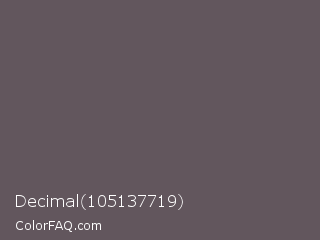 Decimal 105137719 Color is a normal magenta color and the nearest color is Zambezi #685558. Hex code #62565d and RGB value is rgb(98,86,93). In RGB color space, this color is composed of 38% red, 34% green, 36% blue, In CMYK color space, this color is composed of 0% cyan, 12% magenta, 5% yellow , 62% black , In HSL color space, this color has a hue angle of 325° , 7% saturation and 36% lightness.