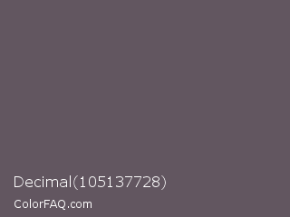 Decimal 105137728 Color is a normal magenta color and the nearest color is Zambezi #685558. Hex code #625660 and RGB value is rgb(98,86,96). In RGB color space, this color is composed of 38% red, 34% green, 38% blue, In CMYK color space, this color is composed of 0% cyan, 12% magenta, 2% yellow , 62% black , In HSL color space, this color has a hue angle of 310° , 7% saturation and 36% lightness.
