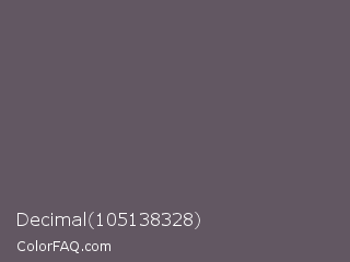 Decimal 105138328 Color is a normal magenta color and the nearest color is Scarpa Flow #585562. Hex code #625762 and RGB value is rgb(98,87,98). In RGB color space, this color is composed of 38% red, 34% green, 38% blue, In CMYK color space, this color is composed of 0% cyan, 11% magenta, 0% yellow , 62% black , In HSL color space, this color has a hue angle of 300° , 6% saturation and 36% lightness.