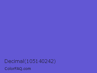 Decimal 105140242 Color is a normal indigo color and the nearest color is Majorelle Blue #6050dc. Hex code #6257d4 and RGB value is rgb(98,87,212). In RGB color space, this color is composed of 38% red, 34% green, 83% blue, In CMYK color space, this color is composed of 54% cyan, 59% magenta, 0% yellow , 17% black , In HSL color space, this color has a hue angle of 245° , 59% saturation and 59% lightness.