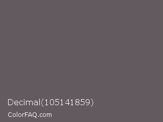 Decimal 105141859 Color is a normal magenta color and the nearest color is Chicago #5d5c58. Hex code #625a5f and RGB value is rgb(98,90,95). In RGB color space, this color is composed of 38% red, 35% green, 37% blue, In CMYK color space, this color is composed of 0% cyan, 8% magenta, 3% yellow , 62% black , In HSL color space, this color has a hue angle of 323° , 4% saturation and 37% lightness.