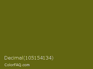 Decimal 105154134 Color is a dark yellow color and the nearest color is Himalaya #6a5d1b. Hex code #626610 and RGB value is rgb(98,102,16). In RGB color space, this color is composed of 38% red, 40% green, 6% blue, In CMYK color space, this color is composed of 4% cyan, 0% magenta, 84% yellow , 60% black , In HSL color space, this color has a hue angle of 63° , 73% saturation and 23% lightness.