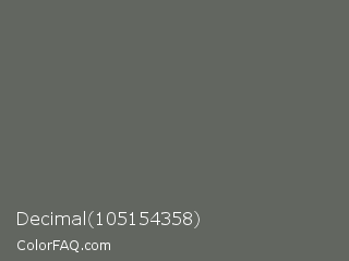 Decimal 105154358 Color is a normal green color and the nearest color is Storm Dust #646463. Hex code #626660 and RGB value is rgb(98,102,96). In RGB color space, this color is composed of 38% red, 40% green, 38% blue, In CMYK color space, this color is composed of 4% cyan, 0% magenta, 6% yellow , 60% black , In HSL color space, this color has a hue angle of 100° , 3% saturation and 39% lightness.