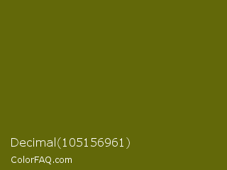 Decimal 105156961 Color is a very dark yellow color and the nearest color is Olivetone #716e10. Hex code #626809 and RGB value is rgb(98,104,9). In RGB color space, this color is composed of 38% red, 41% green, 4% blue, In CMYK color space, this color is composed of 6% cyan, 0% magenta, 91% yellow , 59% black , In HSL color space, this color has a hue angle of 64° , 84% saturation and 22% lightness.