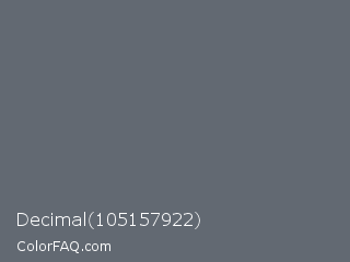 Decimal 105157922 Color is a normal blue color and the nearest color is Shuttle Gray #5f6672. Hex code #626972 and RGB value is rgb(98,105,114). In RGB color space, this color is composed of 38% red, 41% green, 45% blue, In CMYK color space, this color is composed of 14% cyan, 8% magenta, 0% yellow , 55% black , In HSL color space, this color has a hue angle of 214° , 8% saturation and 42% lightness.