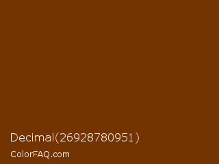 Decimal 26928780951 Color is a dark orange color and the nearest color is Red Beech #7b3801. Hex code #743401 and RGB value is rgb(116,52,1). In RGB color space, this color is composed of 45% red, 20% green, 0% blue, In CMYK color space, this color is composed of 0% cyan, 55% magenta, 99% yellow , 55% black , In HSL color space, this color has a hue angle of 27° , 98% saturation and 23% lightness.