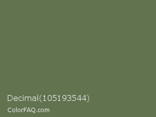 Decimal 105193544 Color is a normal green color and the nearest color is Siam #646a54. Hex code #627350 and RGB value is rgb(98,115,80). In RGB color space, this color is composed of 38% red, 45% green, 31% blue, In CMYK color space, this color is composed of 15% cyan, 0% magenta, 30% yellow , 55% black , In HSL color space, this color has a hue angle of 89° , 18% saturation and 38% lightness.