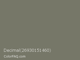 Decimal 26930151460 Color is a normal yellow color and the nearest color is Limed Ash #747d63. Hex code #767768 and RGB value is rgb(118,119,104). In RGB color space, this color is composed of 46% red, 47% green, 41% blue, In CMYK color space, this color is composed of 1% cyan, 0% magenta, 13% yellow , 53% black , In HSL color space, this color has a hue angle of 64° , 7% saturation and 44% lightness.