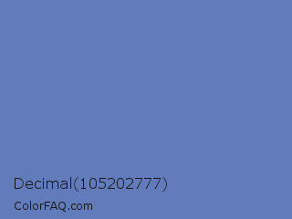 Decimal 105202777 Color is a normal blue color and the nearest color is Glaucous #6082b6. Hex code #627cbb and RGB value is rgb(98,124,187). In RGB color space, this color is composed of 38% red, 49% green, 73% blue, In CMYK color space, this color is composed of 48% cyan, 34% magenta, 0% yellow , 27% black , In HSL color space, this color has a hue angle of 222° , 40% saturation and 56% lightness.
