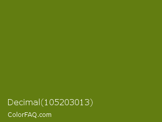 Decimal 105203013 Color is a dark lime color and the nearest color is Fern Frond #657220. Hex code #627d11 and RGB value is rgb(98,125,17). In RGB color space, this color is composed of 38% red, 49% green, 7% blue, In CMYK color space, this color is composed of 22% cyan, 0% magenta, 86% yellow , 51% black , In HSL color space, this color has a hue angle of 75° , 76% saturation and 28% lightness.