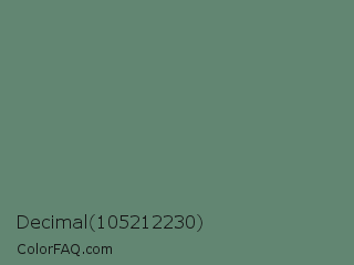 Decimal 105212230 Color is a normal green color and the nearest color is Viridian Green #678975. Hex code #628672 and RGB value is rgb(98,134,114). In RGB color space, this color is composed of 38% red, 53% green, 45% blue, In CMYK color space, this color is composed of 27% cyan, 0% magenta, 15% yellow , 47% black , In HSL color space, this color has a hue angle of 147° , 16% saturation and 45% lightness.