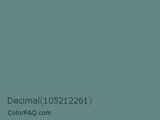 Decimal 105212261 Color is a normal cyan color and the nearest color is Steel Teal #5f8a8b. Hex code #628685 and RGB value is rgb(98,134,133). In RGB color space, this color is composed of 38% red, 53% green, 52% blue, In CMYK color space, this color is composed of 27% cyan, 0% magenta, 1% yellow , 47% black , In HSL color space, this color has a hue angle of 178° , 16% saturation and 45% lightness.